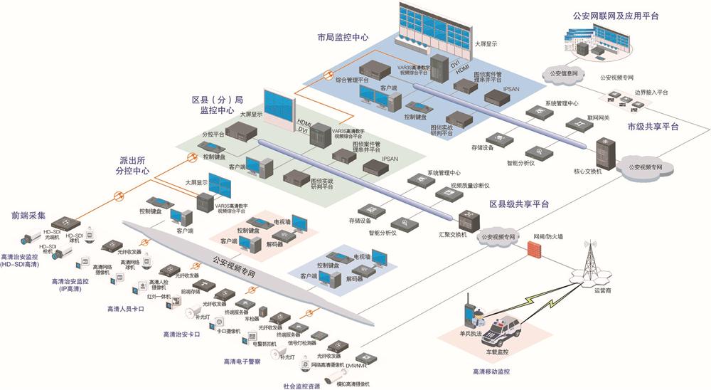 平安城市解决方案以综合应用管理平台为核心,由高清卡口系统、高清电子警察系统、人员卡口系统、城区视频监控系统、无线移动警务系统、社会面资源整合系统等组成,实现对城市“人”、“车”、“物”各类目标全方位视频图像信息的采集与全警种应用。